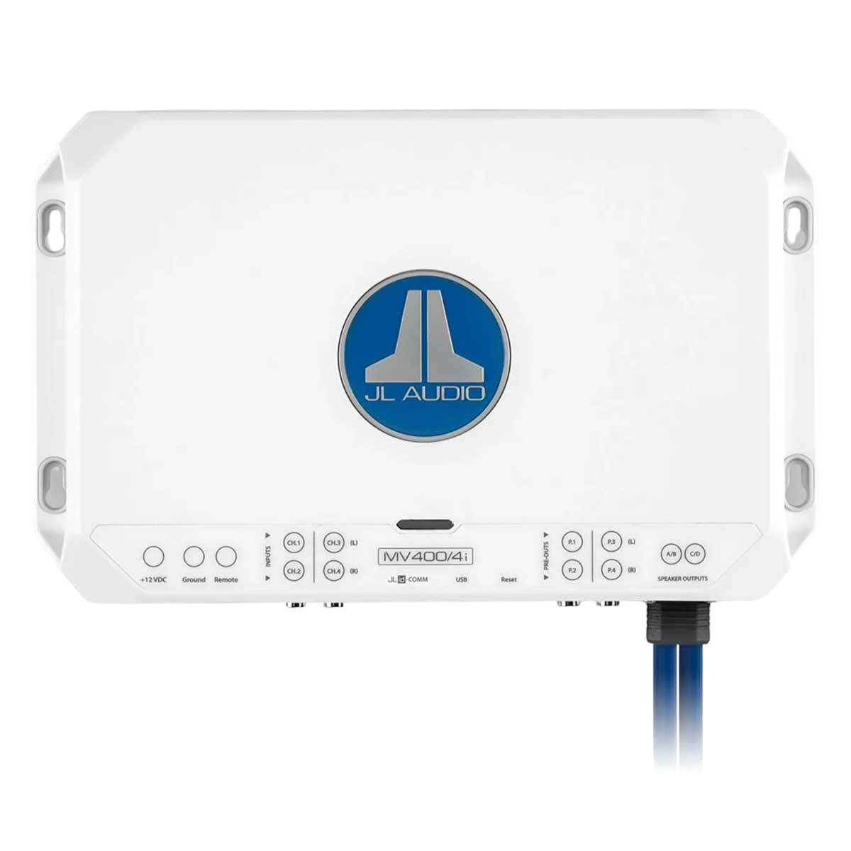 Versatile e potente, l'amplificatore marino JL Audio MV400/4i offre 4 x 75 W e 2 x 200 W in modalità bridged a 4 Ω, con DSP integrato e tecnologia NexD2.