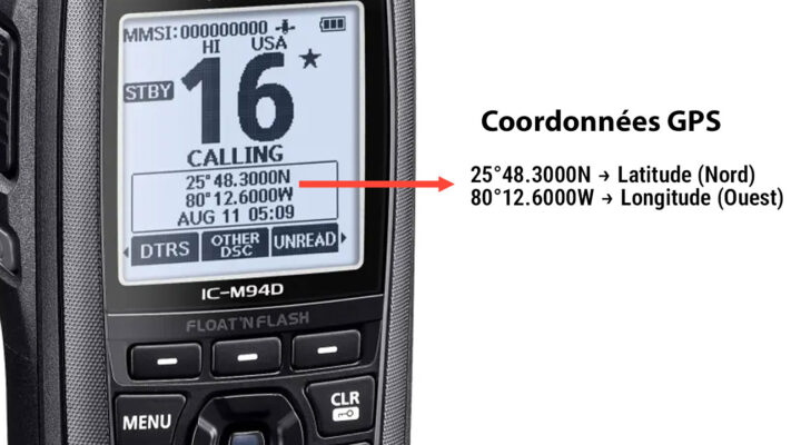 La VHF dispose directement de cette information, ce qui permet d’être plus rapide et plus précis au moment où cela compte vraiment. Sur les modèles compatibles ASN/DSC, cette position peut être envoyée automatiquement dans l’appel de détresse.