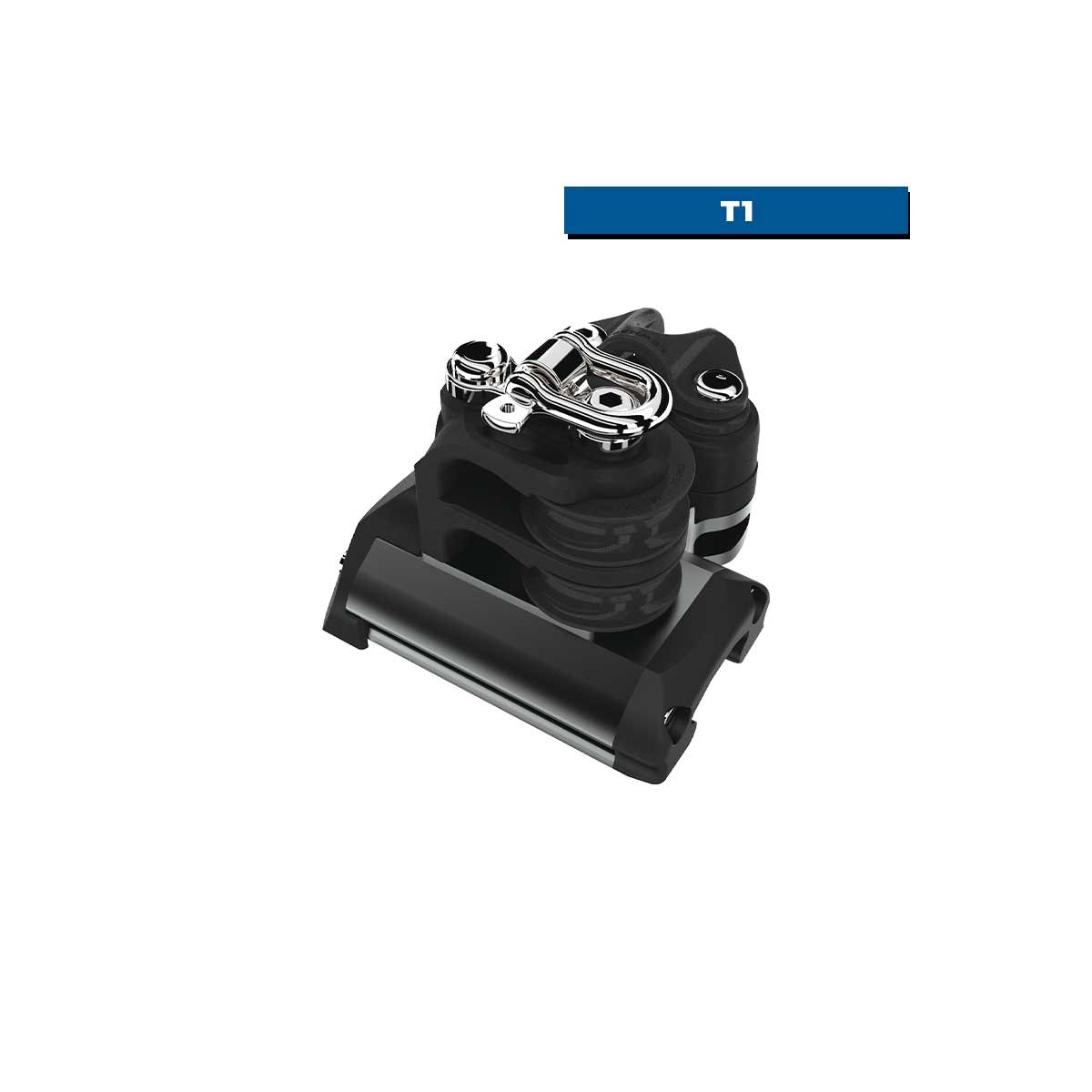 I fermi T1 Lewmar con doppia puleggia, ghiera e tacchetta sono progettati per fissare la fine della corsa del carrello e semplificare le regolazioni.