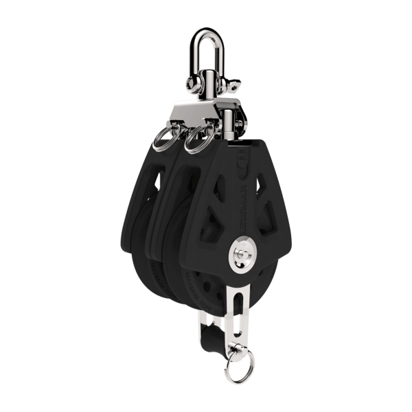 Il doppio bozzello Synchro con anello, dotato di puleggia da 50 mm, è progettato per aumentare la velocità e l'efficienza dei paranchi per vele di grandi dimensioni-. La sua geometria ottimizzata e l'anello di supporto in materiale composito si muovono dolcemente con la corda, per un trasferimento del carico più fluido e un minore attrito. Con un peso di soli 164 g, è in grado di sopportare un carico di lavoro di 450 kg e presenta una struttura robusta con una girella che si blocca senza attrezzi.
