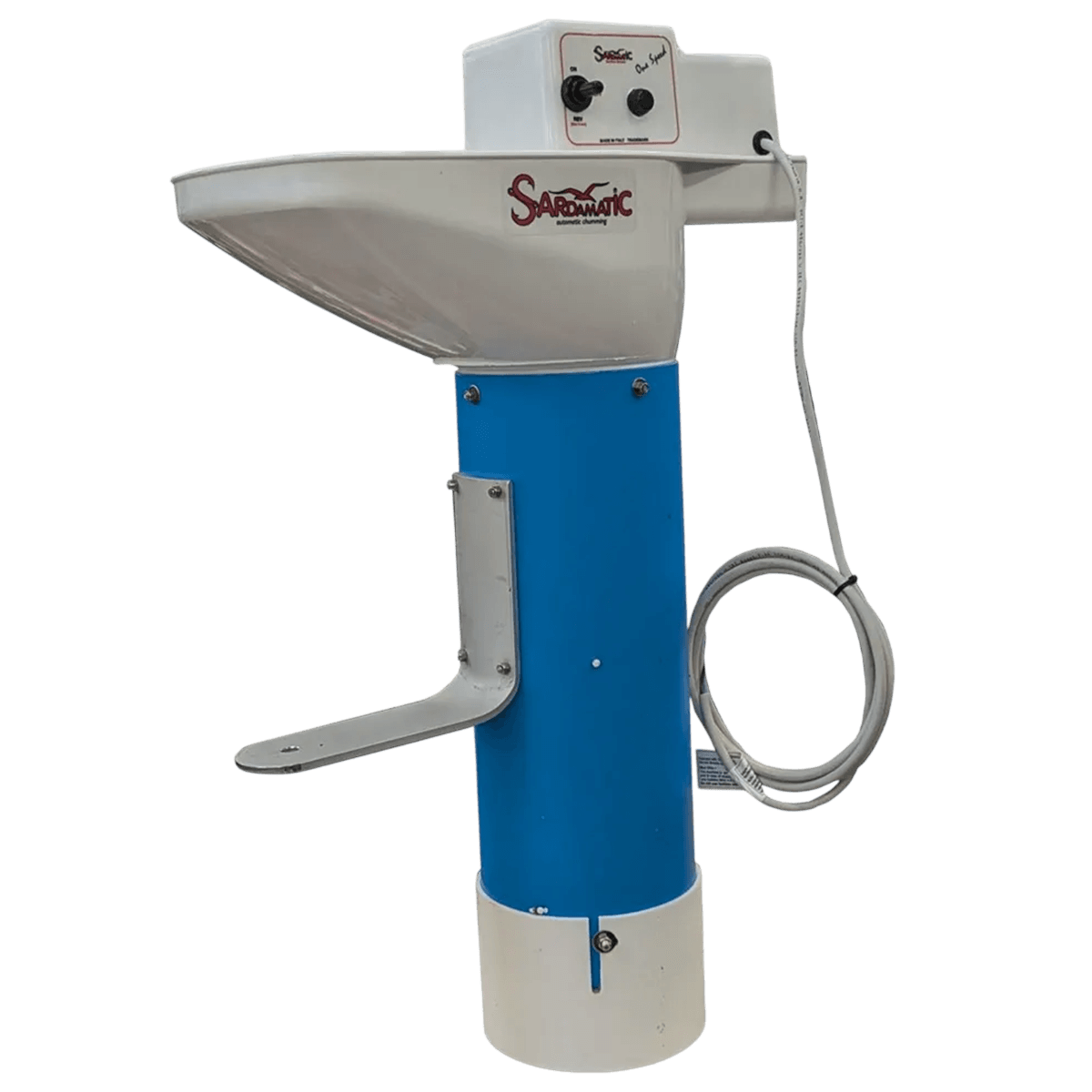 Progettato per la pesca a traina leggera e per le esche a base di sardine, produce un flusso continuo di pezzi, polpa e sangue per trattenere i pesci sotto la barca. Velocità fissa di 18 giri/minuto per risultati costanti, invertendo la rotazione a seconda delle necessità, circa 20 minuti per un carico di 3,5 kg. Leggero, compatto, facile da montare e da pulire.