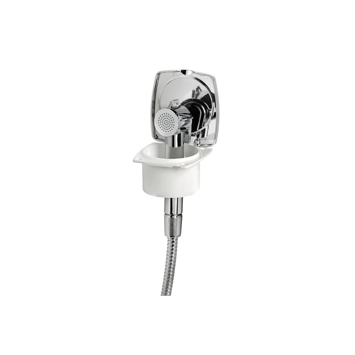 Soffione in ABS cromato, alloggiamento in ASA bianco resistente ai raggi UV.