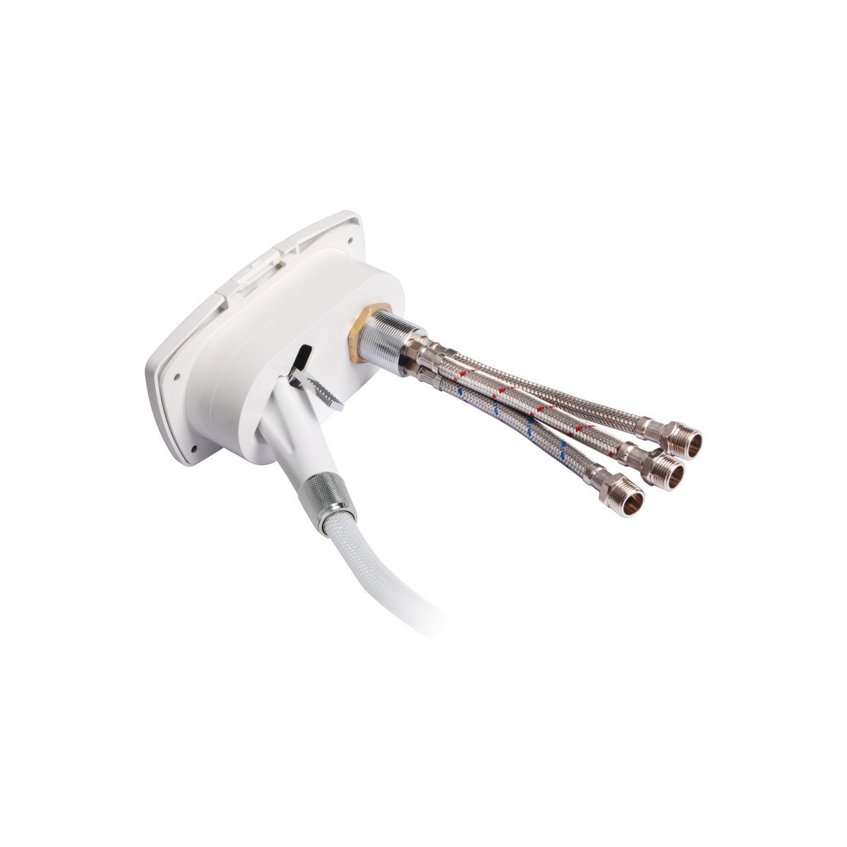 Soffione in plastica con testa cromata e alloggiamento in ASA bianco, resistente ai raggi UV. Con miscelatore acqua calda/fredda. Versione a parete.