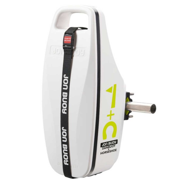 In questo caso, il sistema Jon Buoy MK3 è riposto in un contenitore nero che si adatta al balcone di poppa, ma è disponibile anche in un contenitore bianco.