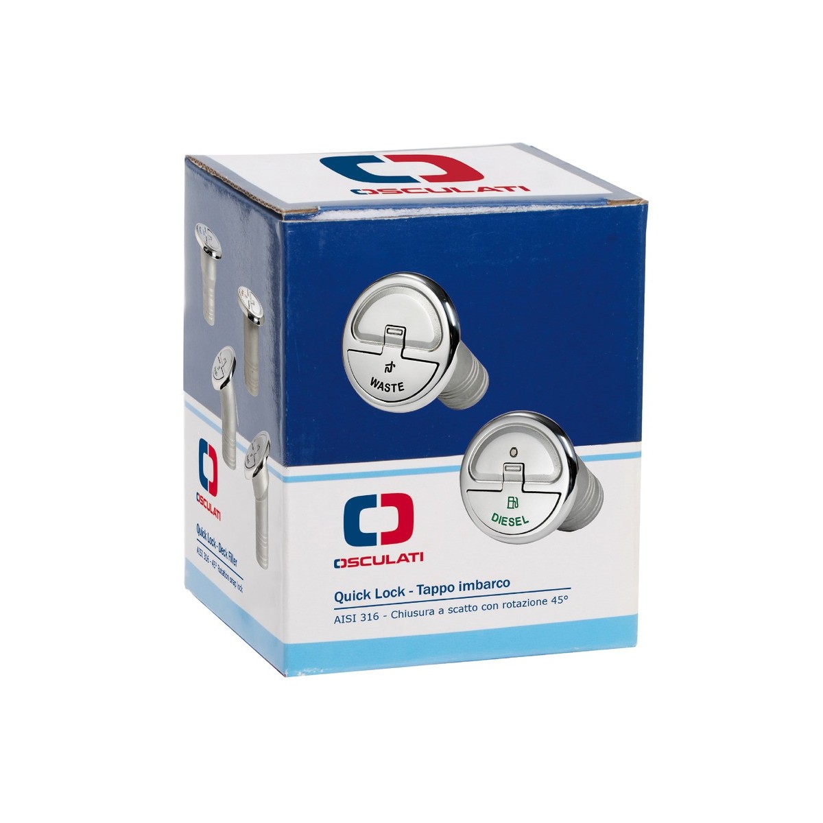 Serratura a scatto con rotazione di 45°; sporgenza di soli 7,7 mm; viti a scomparsa; cavo di fissaggio in acciaio inox con molla; versioni per olio e diesel con morsetto per cavo di terra; in acciaio inox AISI 316 lucidato a specchio; simboli della normativa DIN.