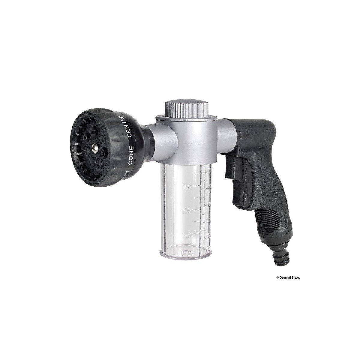 Pistola a spruzzo OSCULATI con serbatoio per prodotti detergenti per tubo da giardino con attacco rapido maschio; ideale per la manutenzione di barche e camper-auto. Con 7 diversi getti.