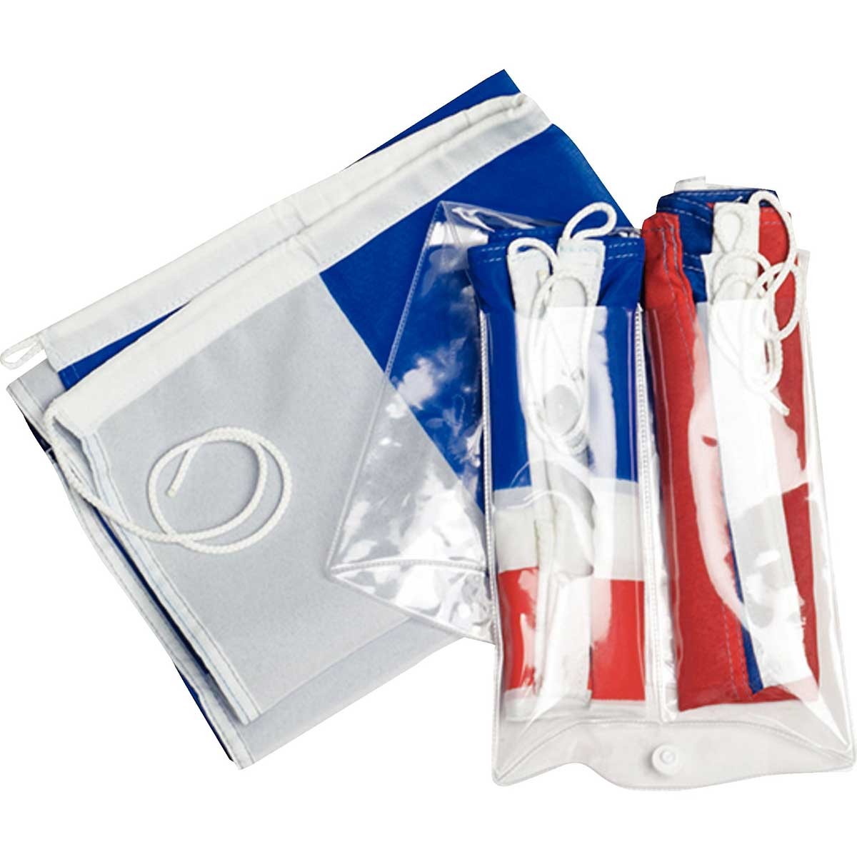 Astuccio trasparente di 50 x 60 cm con orli in poliestere. Include tre bandiere regolamentari: la bandiera N, la bandiera C e la bandiera nazionale francese.