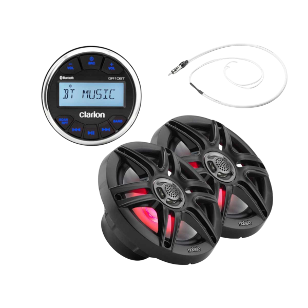 -Il pacchetto audio Clarion Marine fornisce un sistema audio marino completo: lo stereo GR10BT offre connettività Bluetooth e multitasking, gli altoparlanti sportivi CMS da 6,5" sono affidabili e potenti e l'antenna AM/FM Motorola garantisce una buona ricezione radio.