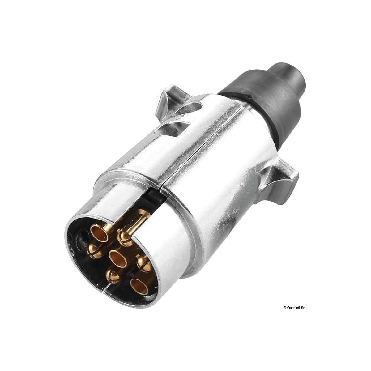 La spina per rimorchio è un connettore a 7 pin con contatti a vite conforme agli standard di traino. Il suo robusto alloggiamento in metallo, unito ai contatti interni in ottone cromato, garantisce un'eccellente durata e un'elevata resistenza alla corrosione in ambienti marini.