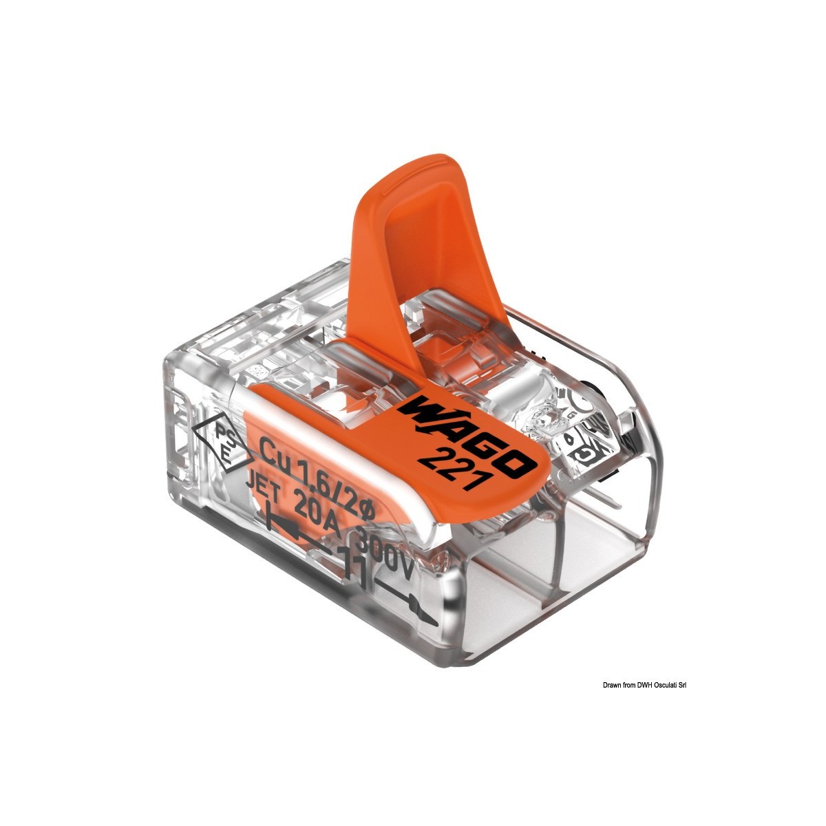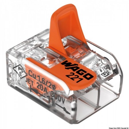I connettori WAGO® Serie 221 consentono di collegare tutti i tipi di conduttore in modo rapido e sicuro, grazie a una pratica leva di serraggio. Possono essere installati su guide DIN o tramite avvitamento e le loro staffe possono essere installate in orizzontale o in verticale. Possono resistere a temperature ambiente fino a 85°C.