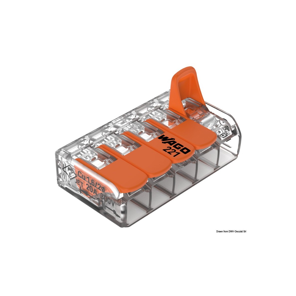 I connettori WAGO Serie 221 (x15) consentono di collegare tutti i tipi di conduttori in modo rapido e sicuro grazie a una pratica leva di serraggio. Possono essere installati su guide DIN o tramite avvitamento e le loro staffe possono essere installate in orizzontale o in verticale. Possono resistere a temperature ambiente fino a 85°C.