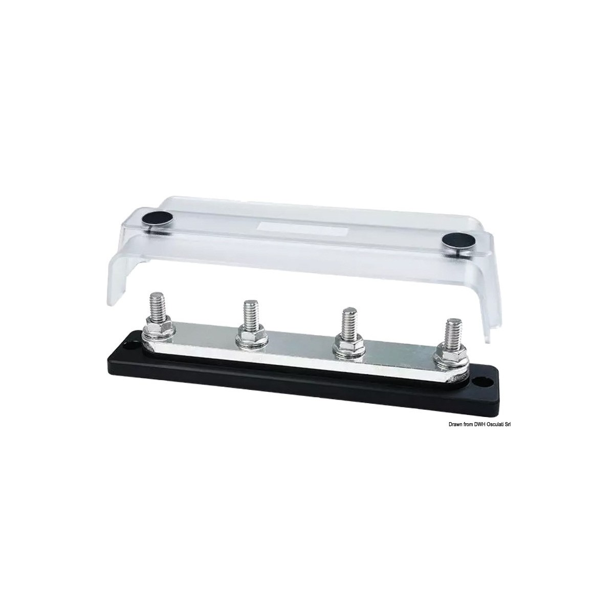 Nastro di distribuzione Techno per impieghi gravosi con coperchio trasparente, progettato per installazioni fino a 48 V e 250 A continui. La base in tecnopolimero e le barre in rame stagnato con viti in acciaio inox garantiscono una conduttività ottimale. I cavi sono fissati senza dadi e possono essere orientati liberamente per un'installazione marina semplice e affidabile.