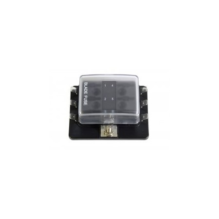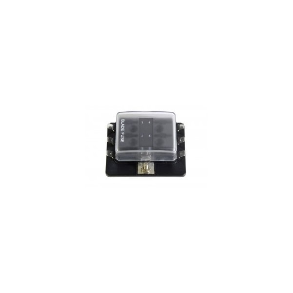 Corpo in policarbonato con coperchio trasparente. Capacità di protezione a 6 canali (30A max per canale / 100A totali). Collegamento a spine piatte da 6,35 mm.