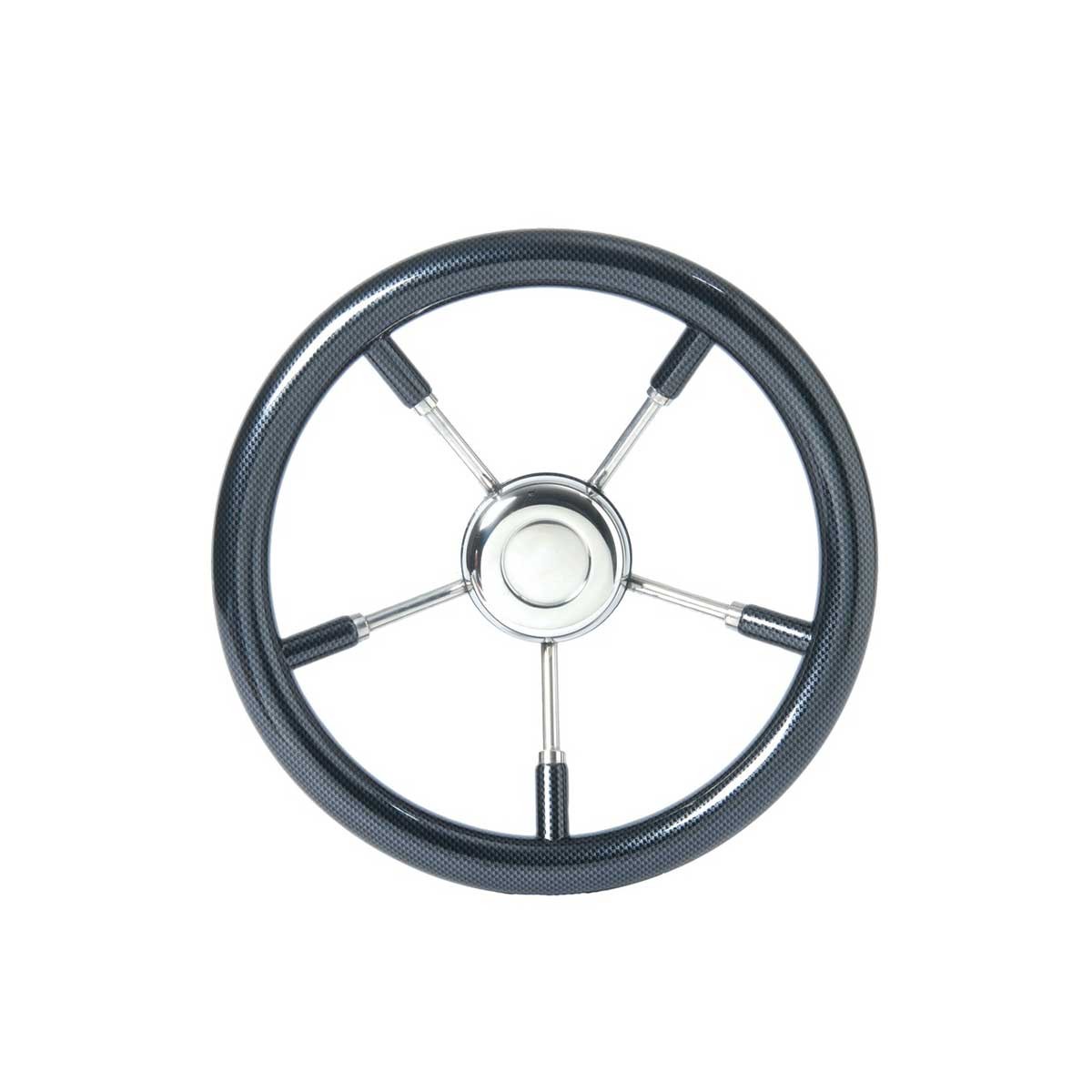 Il volante T9 con razze in acciaio inox e look in carbonio è dotato di un cono universale per la compatibilità con i cavi Ultraflex, Morse o Teleflex.