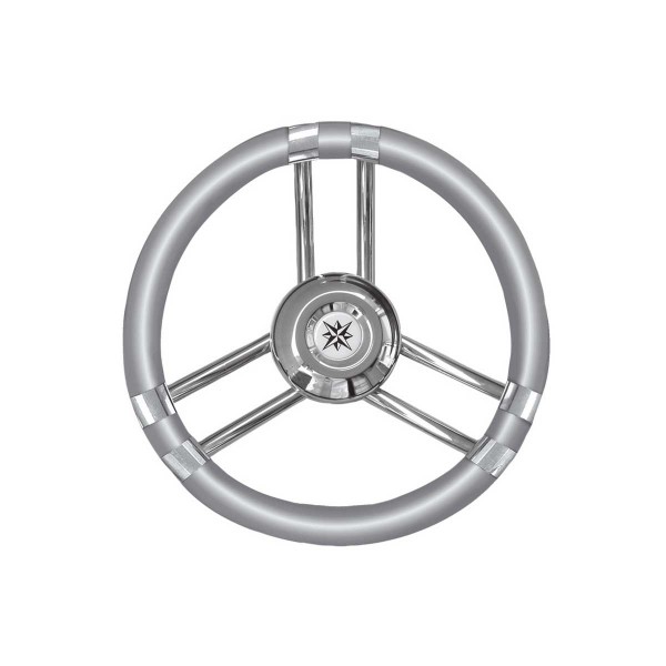 Il volante T21 è dotato di tre razze in acciaio inox e di una corona grigia di Ø 35 cm in poliuretano flessibile per una migliore presa e resistenza marina.
