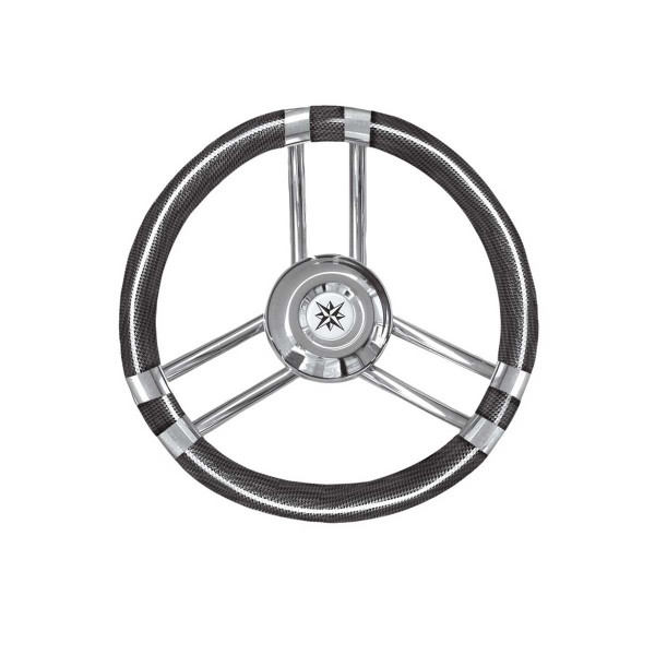 Il volante T21 è dotato di tre razze in acciaio inox e di una corona in carbonio di 35 cm di diametro in poliuretano flessibile per migliorare la presa e la resistenza in mare.